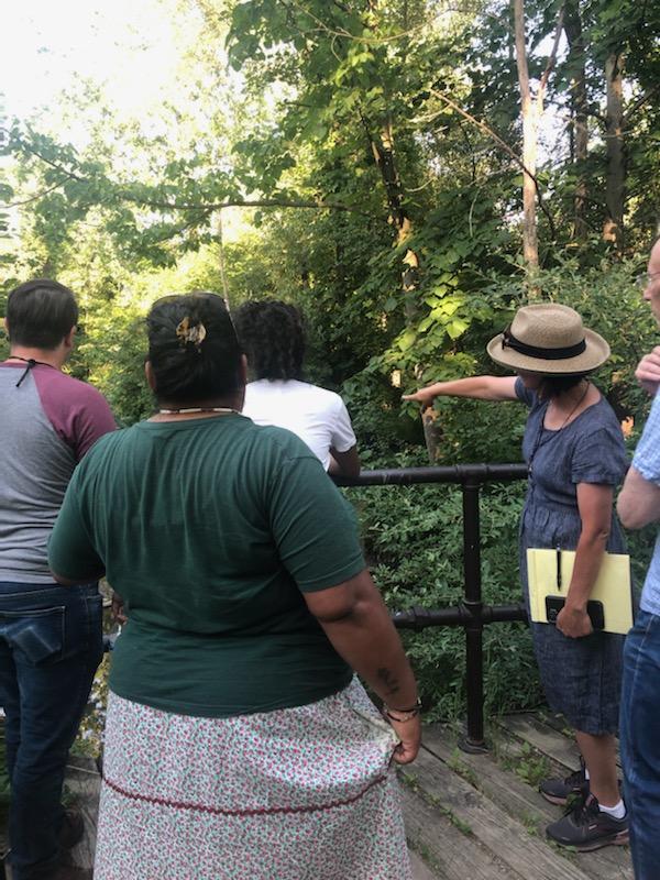 After the feast, we began what we called our Community Assessment. In action this was walking the Land together with our community members, taking note of the plant and animal relatives there and those nearby connected to the Preserve – and how all of these would and could influence one another as the seasons circle round. We observed the direction of the sun and wind, talked about when and how the seasons come to our region, and our leaders listened to the Land. Together we began to dream: what could we see on this Land one day? Rosebud saw water caught off the roof of the tool-storage shed for watering the gitigan (garden). She saw three sisters and medicines growing along the center of the Land. Antonio saw an orchard, fruiting Native trees on the back slope, blending into the forest below. Wayne saw his tribe gathering here for meetings, sitting in a circle. Other community members saw a place for trading goods and a fire pit for cooking and telling stories around. We saw open space to build hide-tanning frames and kettles for processing corn. We saw tables filled with feasts, with knowledge-keepers sharing basket-weaving and beading skills. We saw Wayne and others dancing on the top of the hill. We knew we were moving in a good way. We saw a place to put down tobacco (aseema), to pray, to forage, to gather and just be—something that Urban Native folks often have no land base to support.